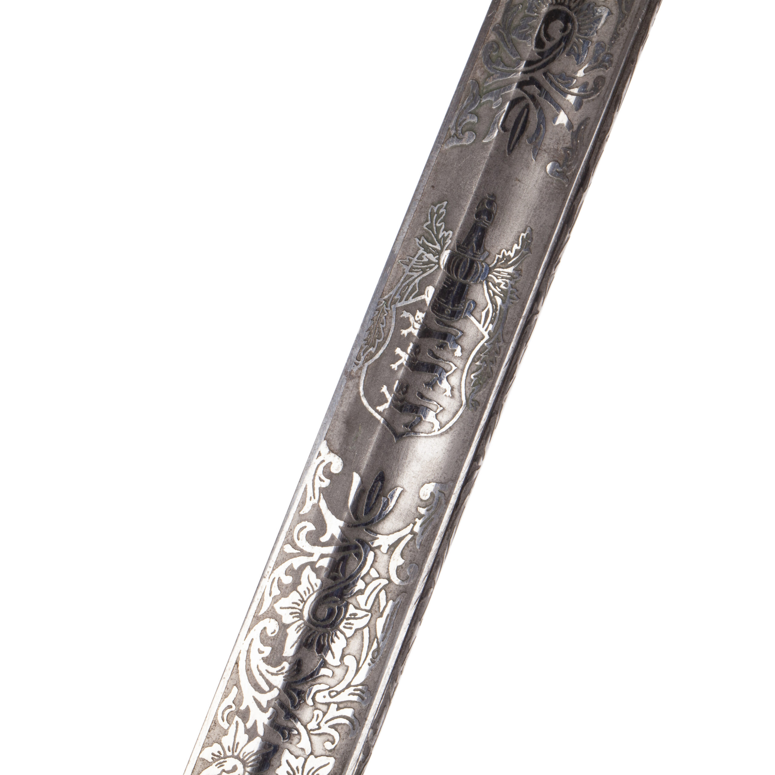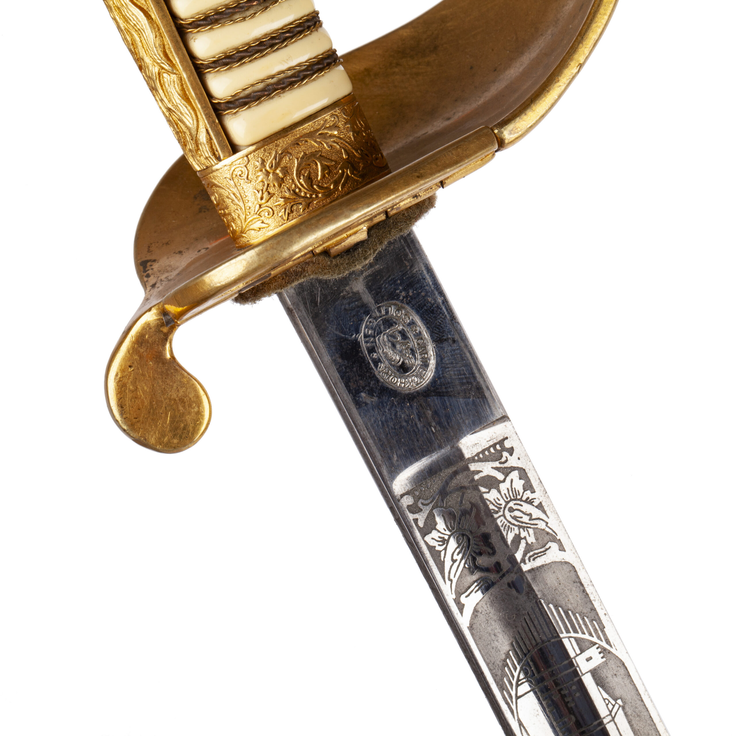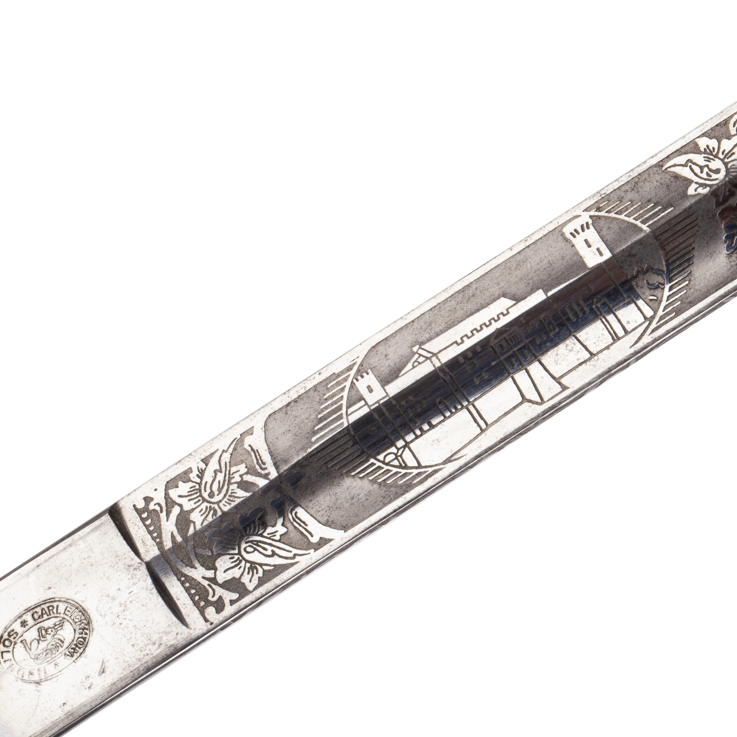 Очень редкая и исторически значимая офицерская сабля ВМС Эстонии межвоенного периода (1920–1930-е гг.), изготовленная по специальному заказу фирмой Carl Eickhorn в Золингене. Клинок из светлой стали украшен изящным травлением с изображением замка Тоомпеа и трех львов Эстонии — национальных символов Эстонского государства.