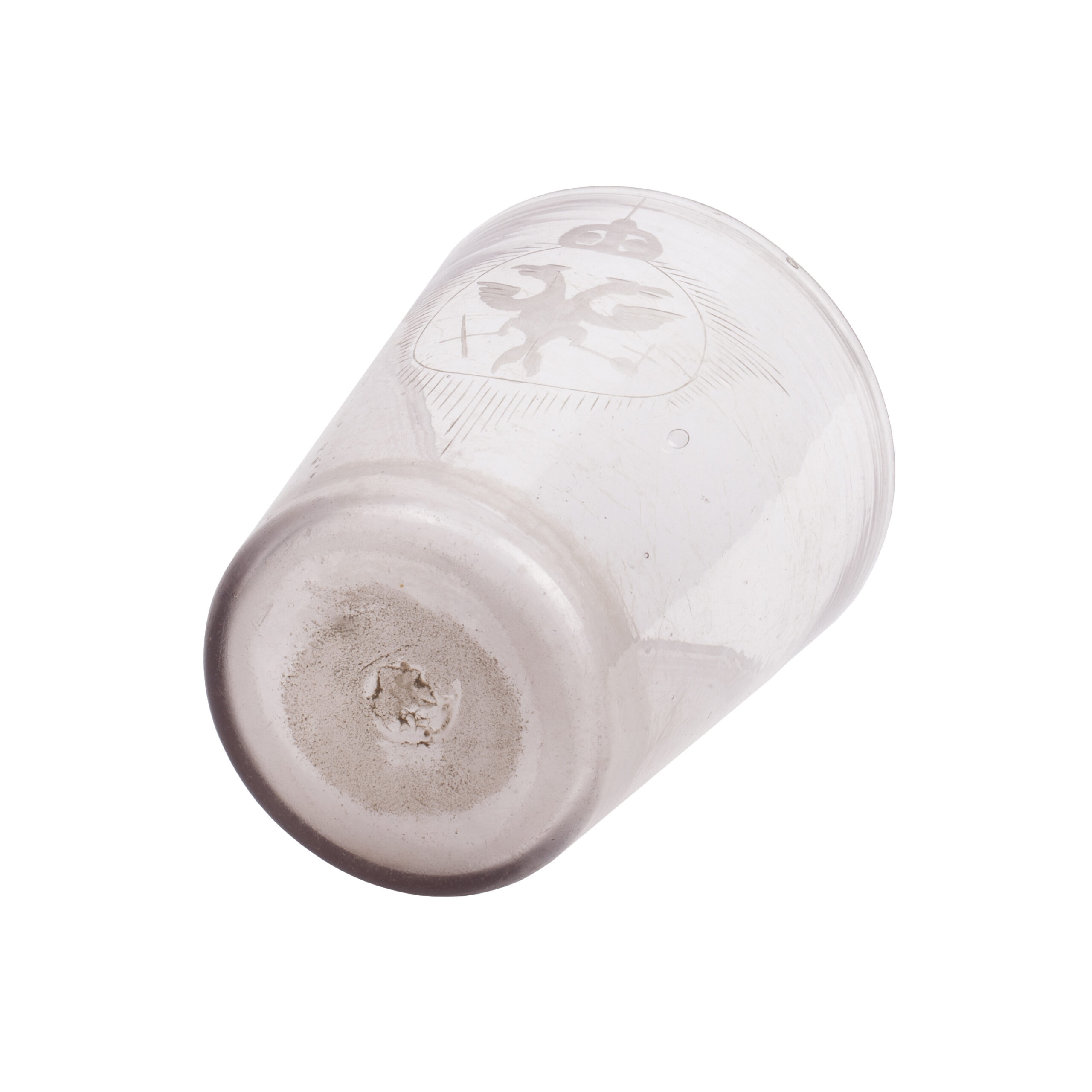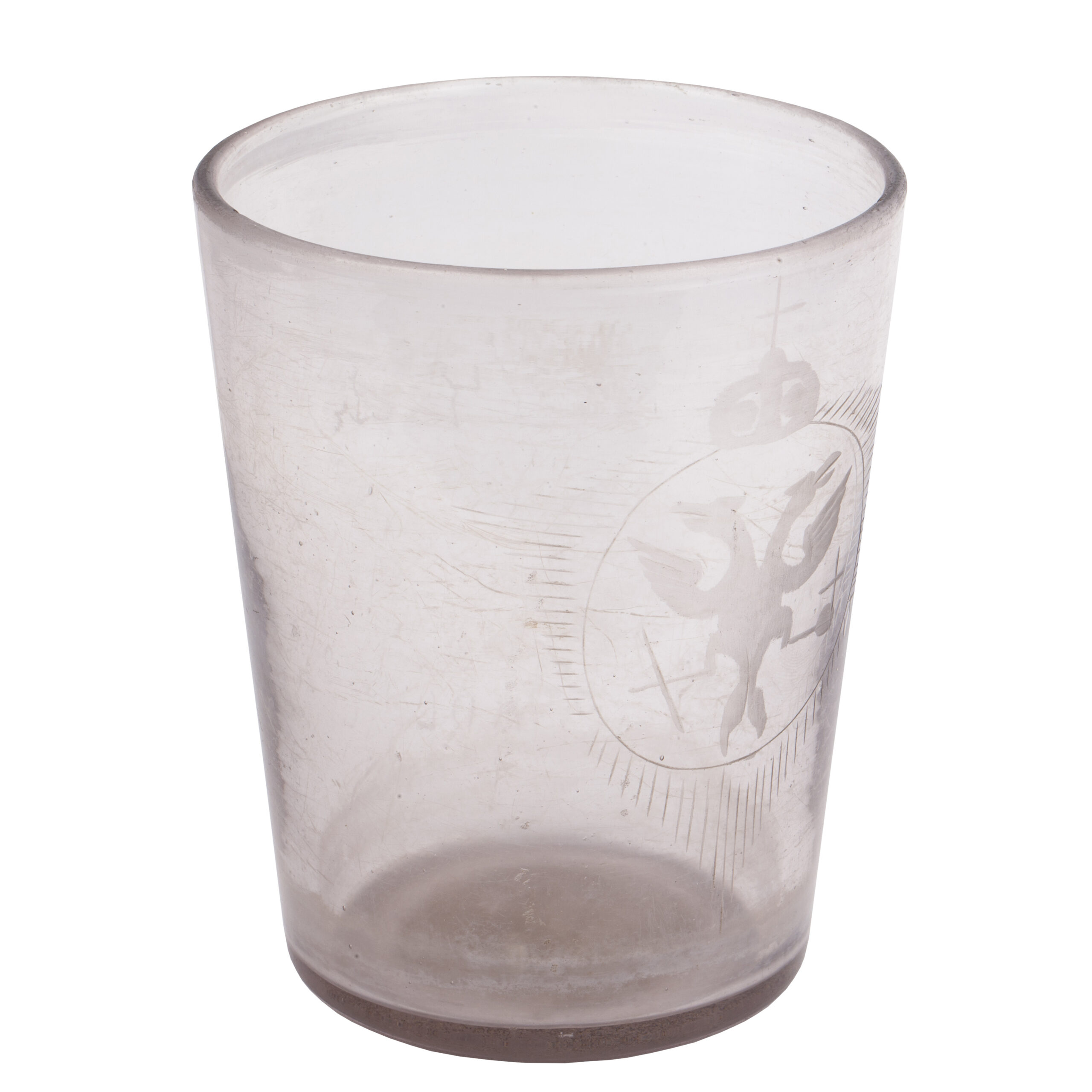 Изящный стакан с гравированным изображением двуглавого орла — ключевой эмблемы Российской империи. Стилистика изображения соответствует геральдическим традициям начала XVIII века. Сосуд в хорошей сохранности, имеются незначительные следы бытования. Аналогичные экземпляры хранятся в собрании Государственного Эрмитажа.