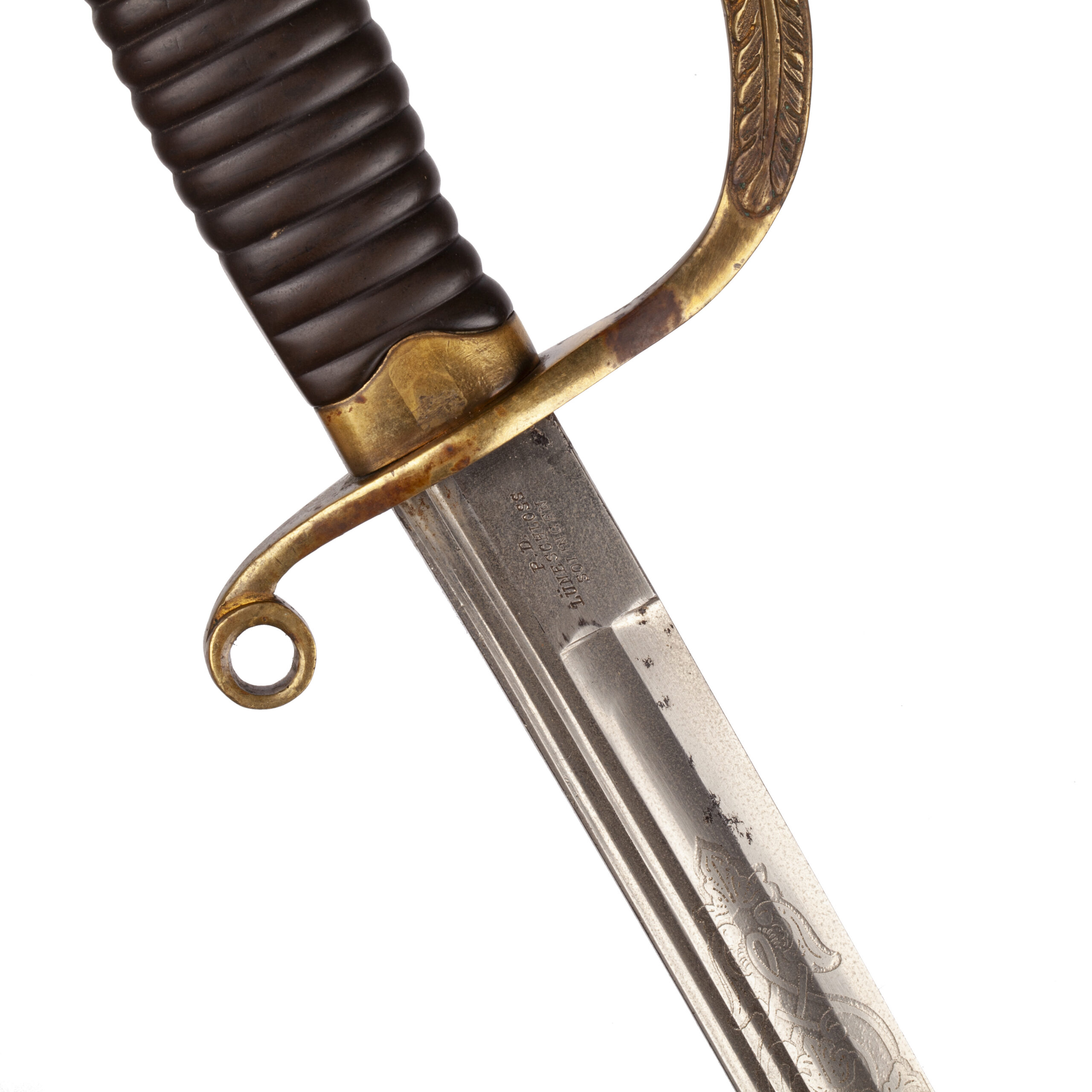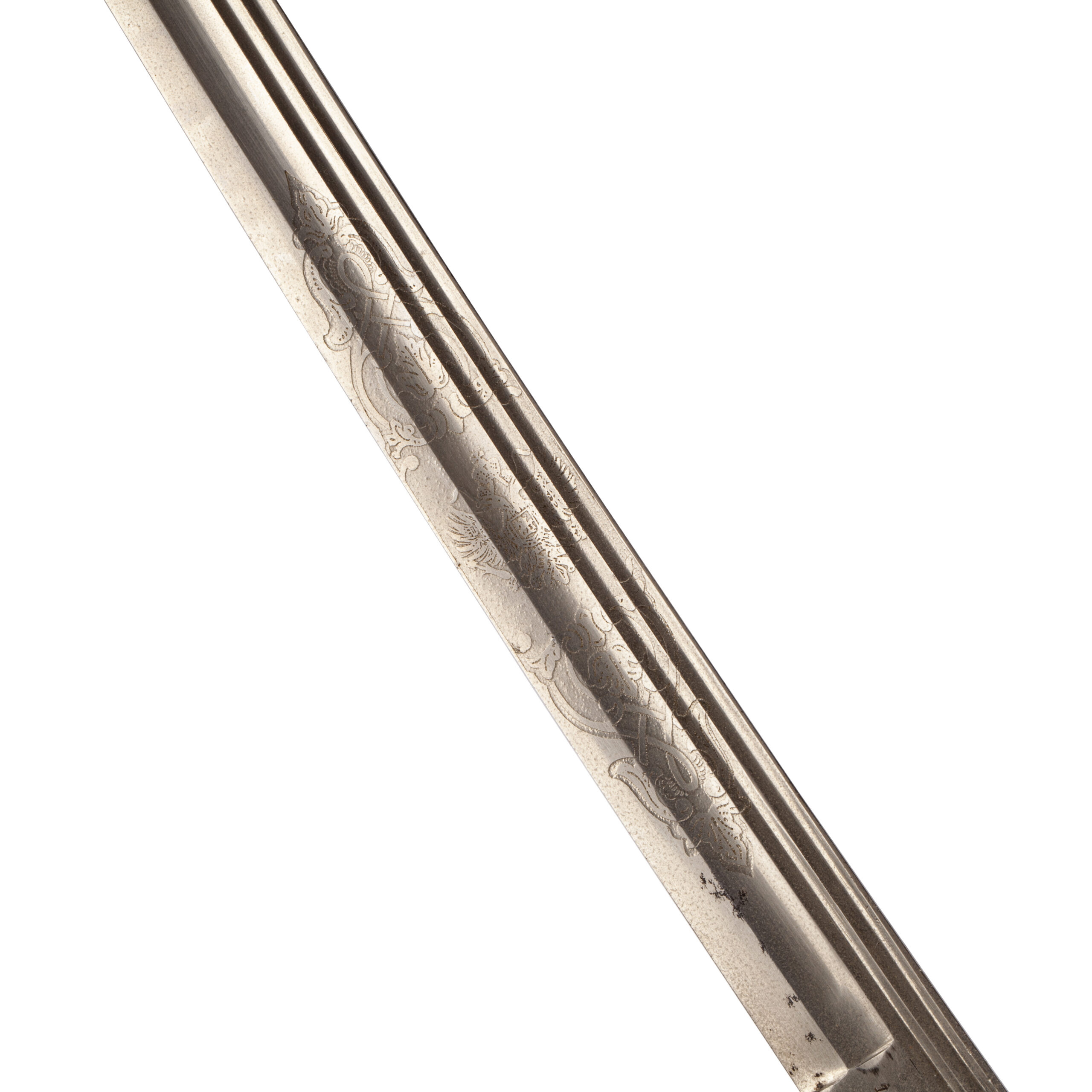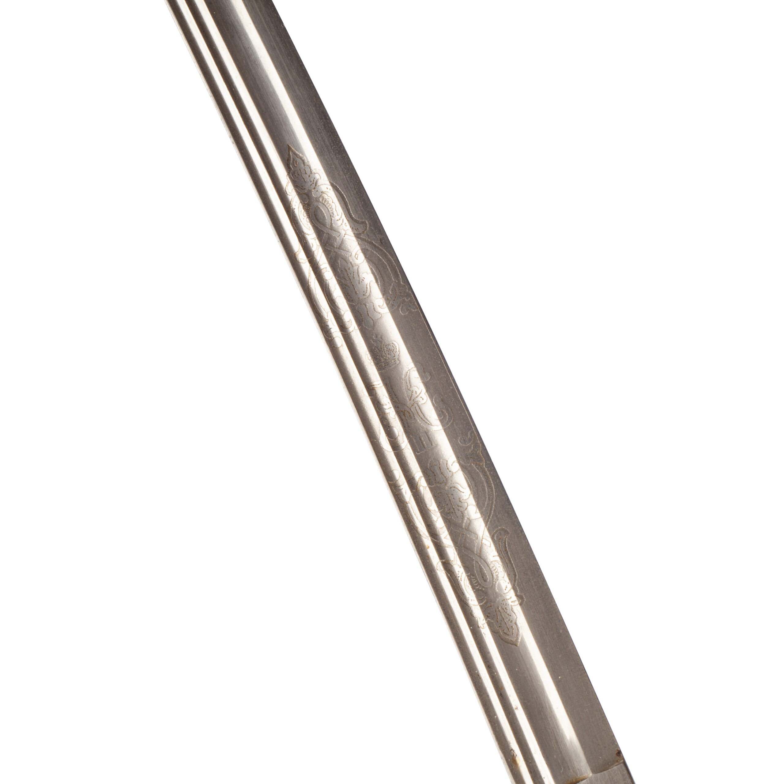Изогнутый однолезвийный клинок с тремя долами украшен с одной стороны травлением двуглавого орла, а с другой — монограммой «Н II» под короной, обозначающей Императора Николая II. На рикассо нанесено клеймо производителя «Peter Daniel Lüneschloss Waffen-Fabrik Solingen» с фирменным символом «меч и весы».