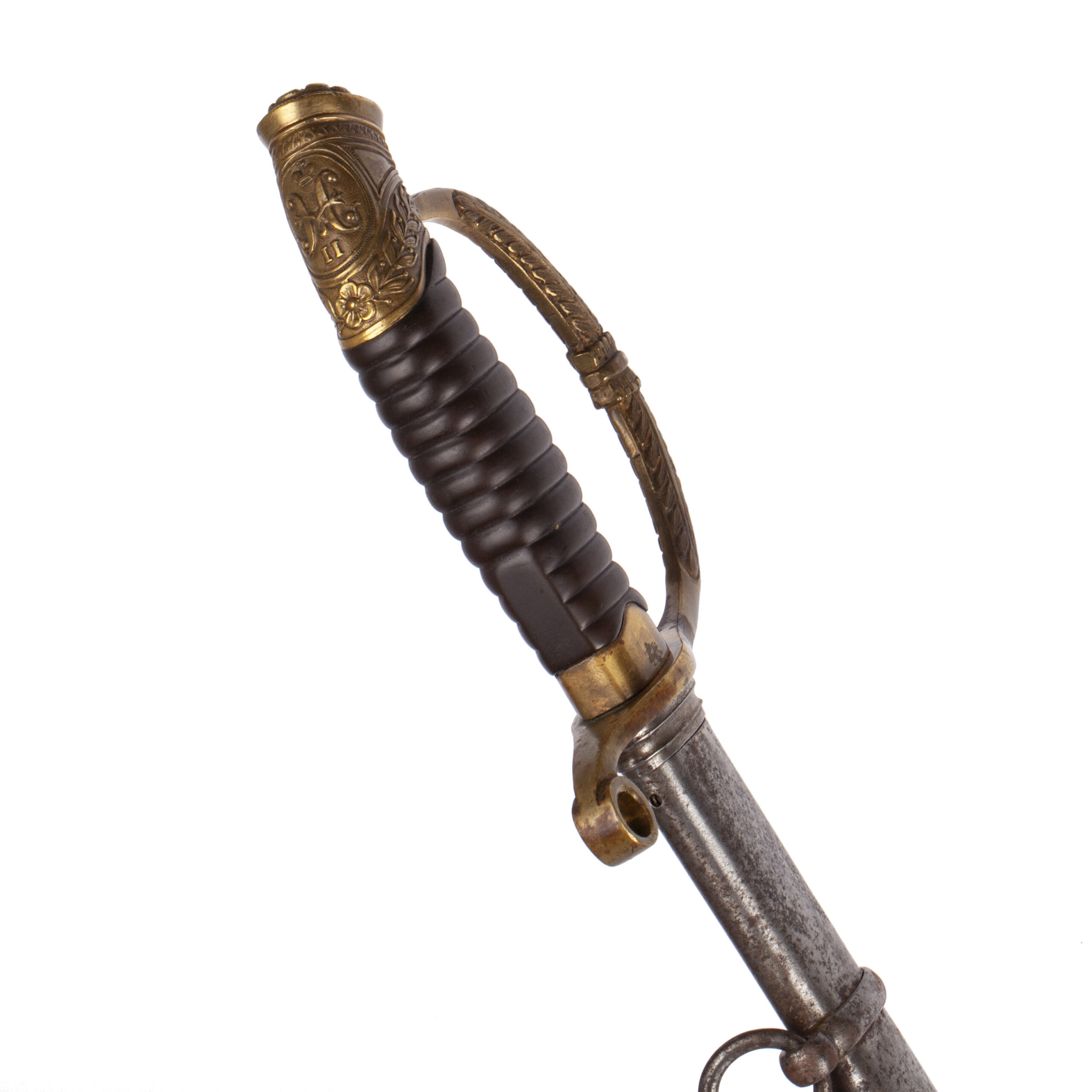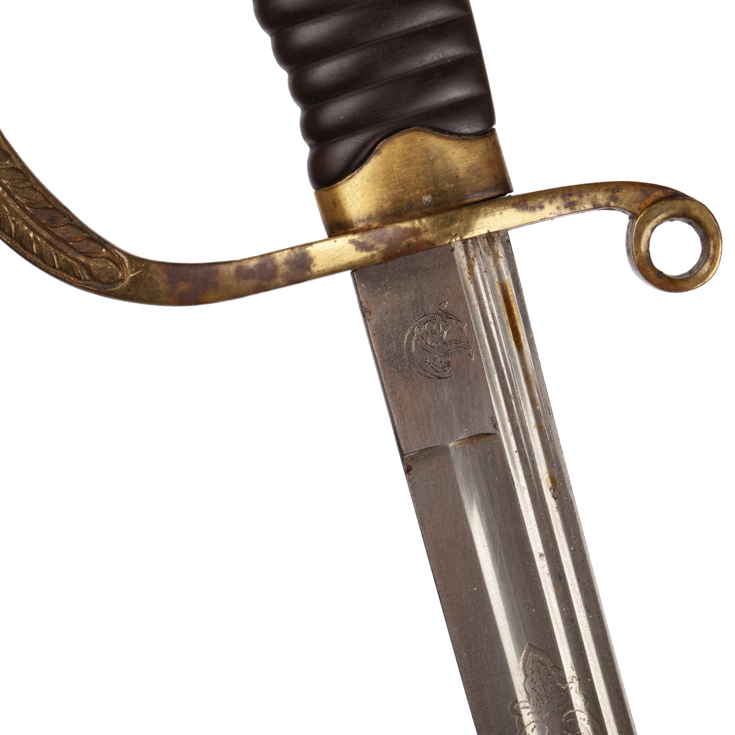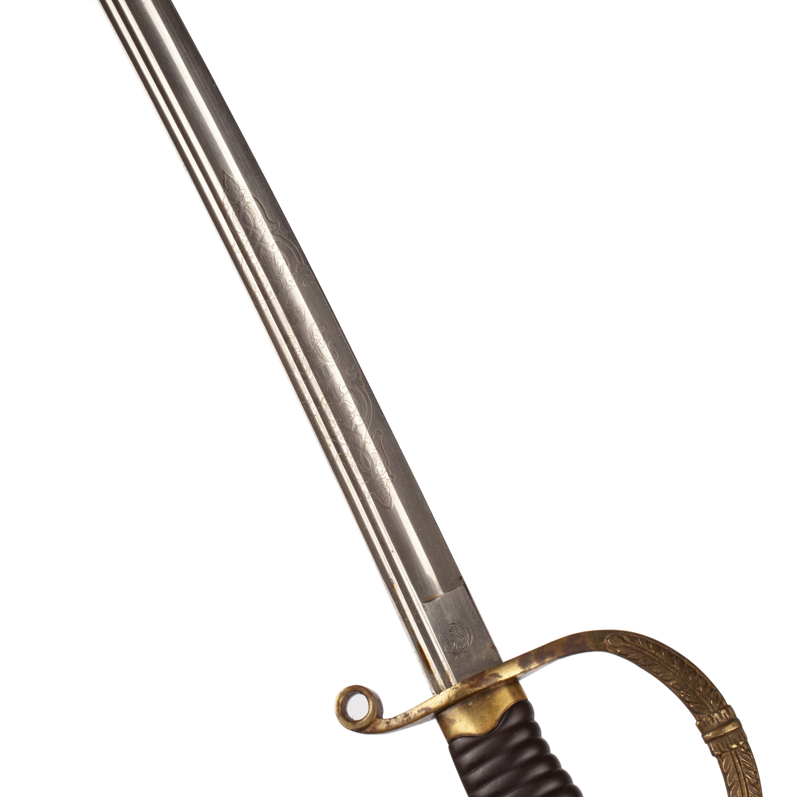 Изогнутый однолезвийный клинок с тремя долами украшен с одной стороны травлением двуглавого орла, а с другой — монограммой «Н II» под короной, обозначающей Императора Николая II. На рикассо нанесено клеймо производителя «Peter Daniel Lüneschloss Waffen-Fabrik Solingen» с фирменным символом «меч и весы».