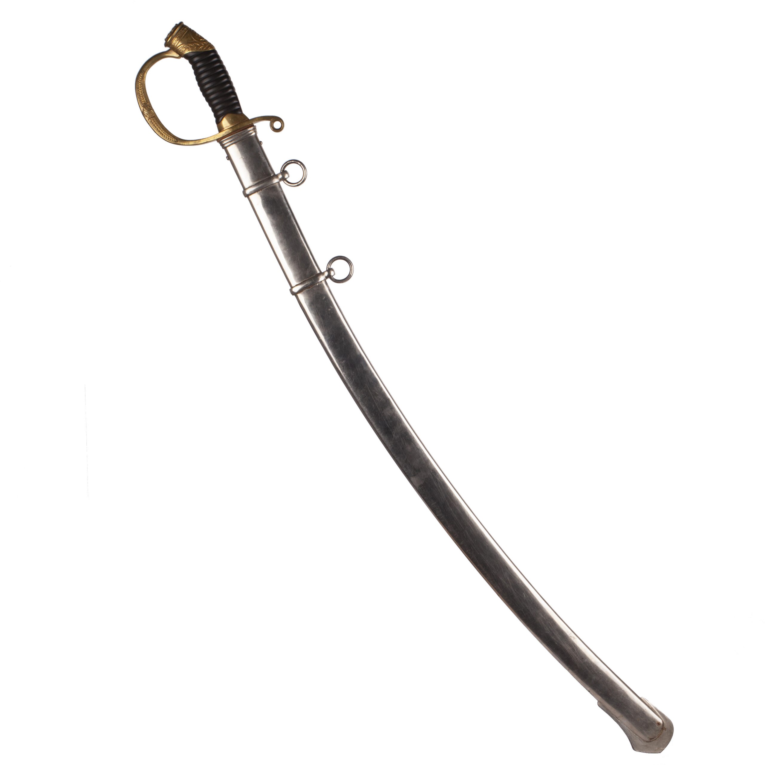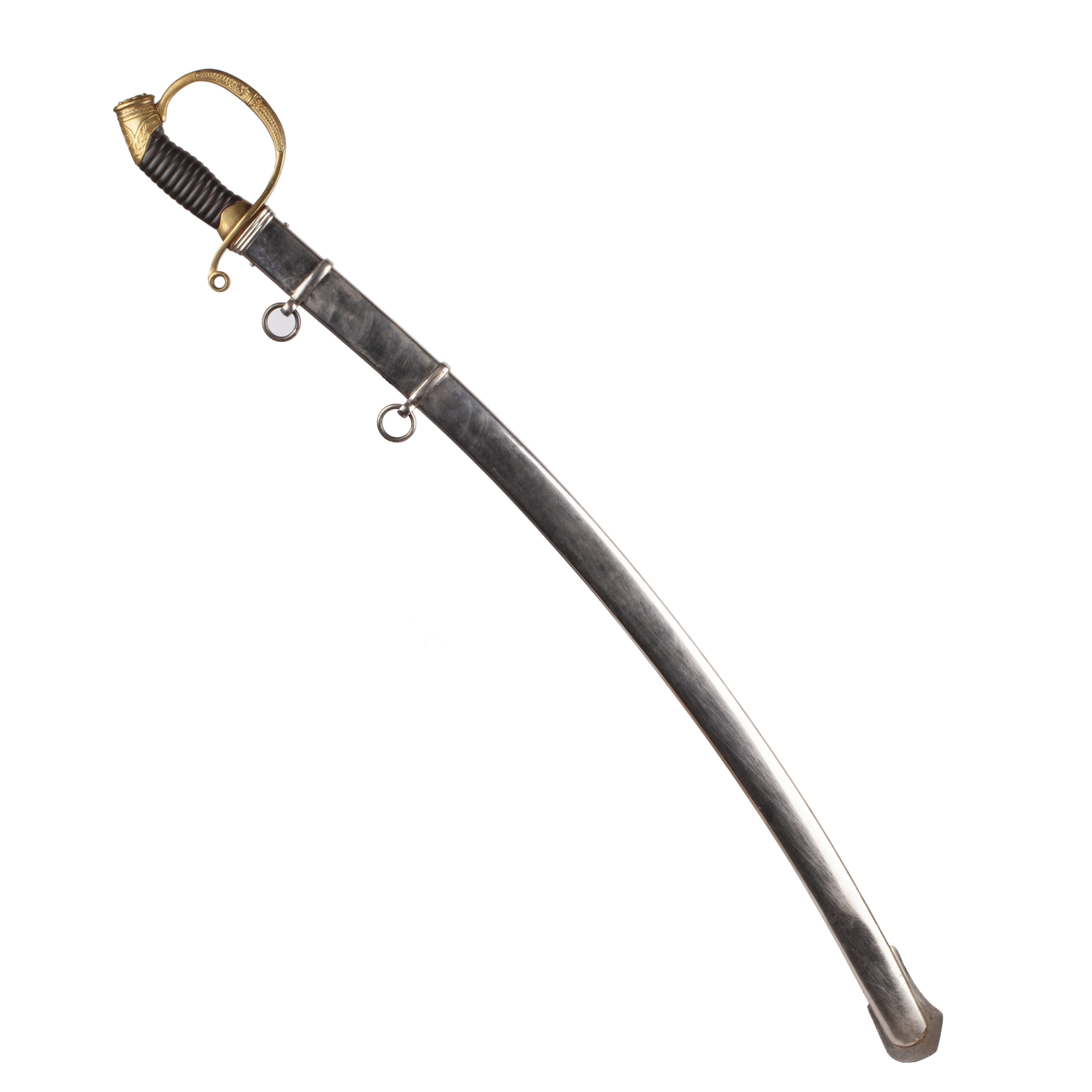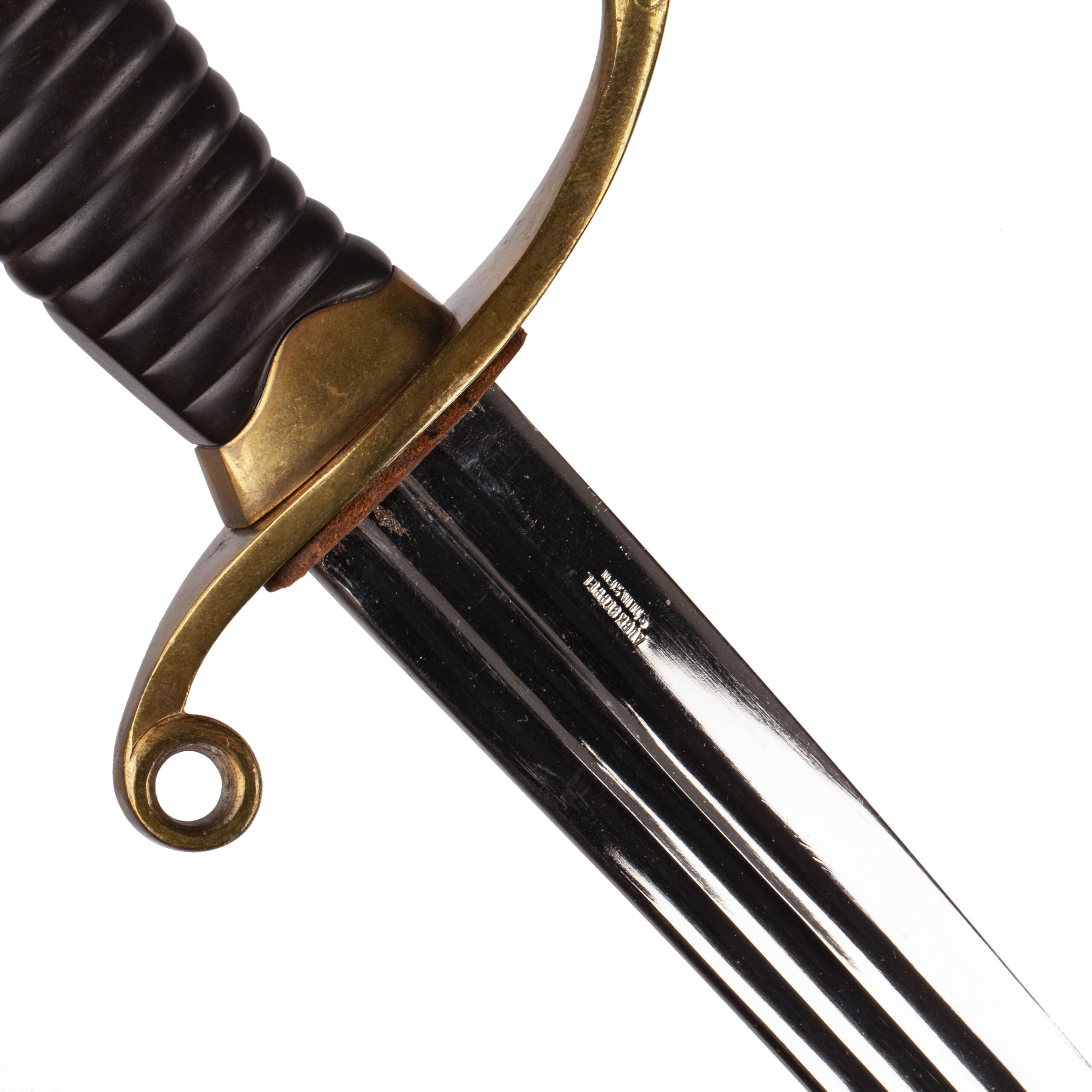 Деревянная рукоять классической формы шашки с выгнутым «клювовидным» навершием несёт отчётливый штамп «SLAVA», вероятно, обозначающий инспекцию или позднейший арсенальный знак. В комплект входят оригинальные металлические ножны с двумя кольцами подвеса, с естественными следами времени, но сохранившие первоначальную конструкцию и детали.