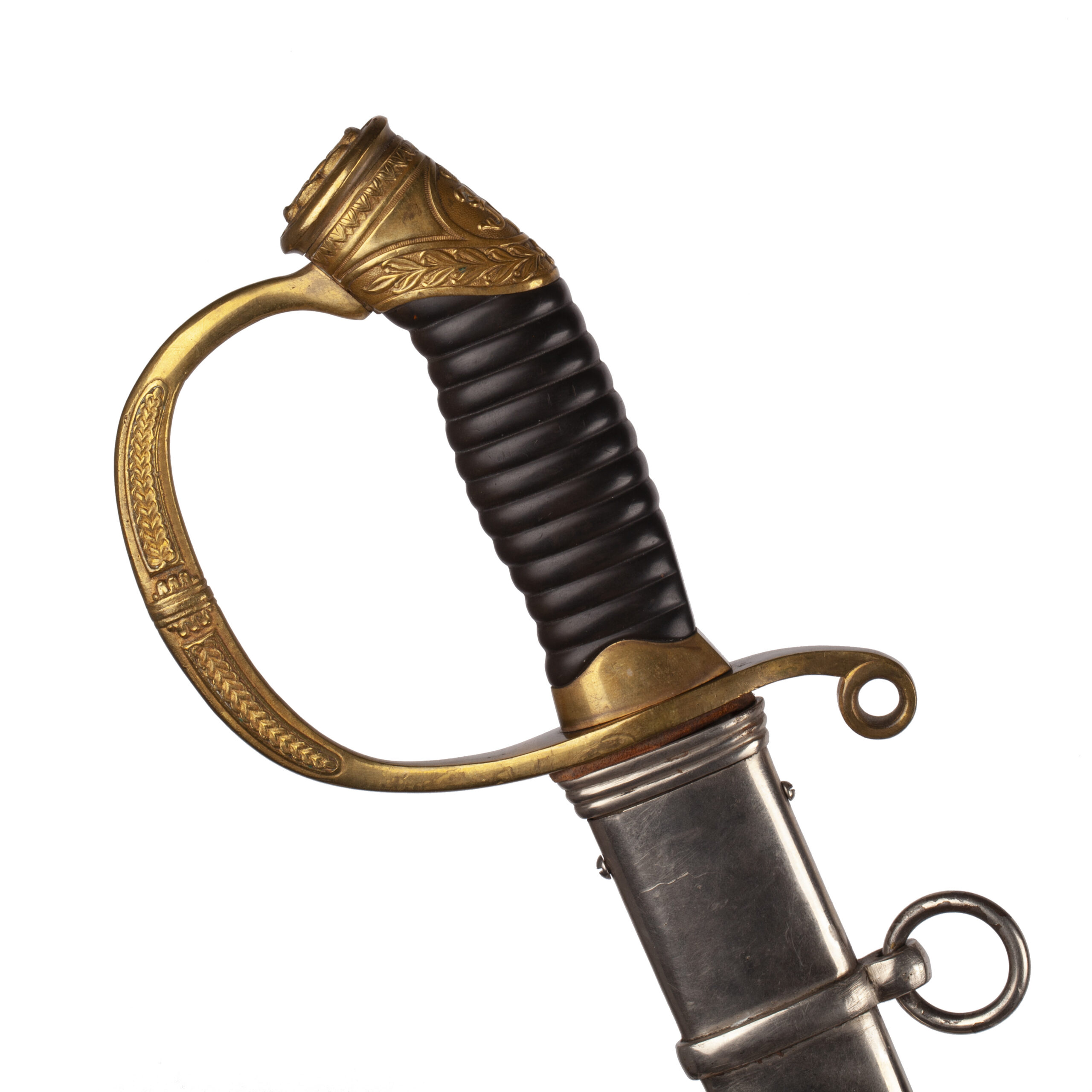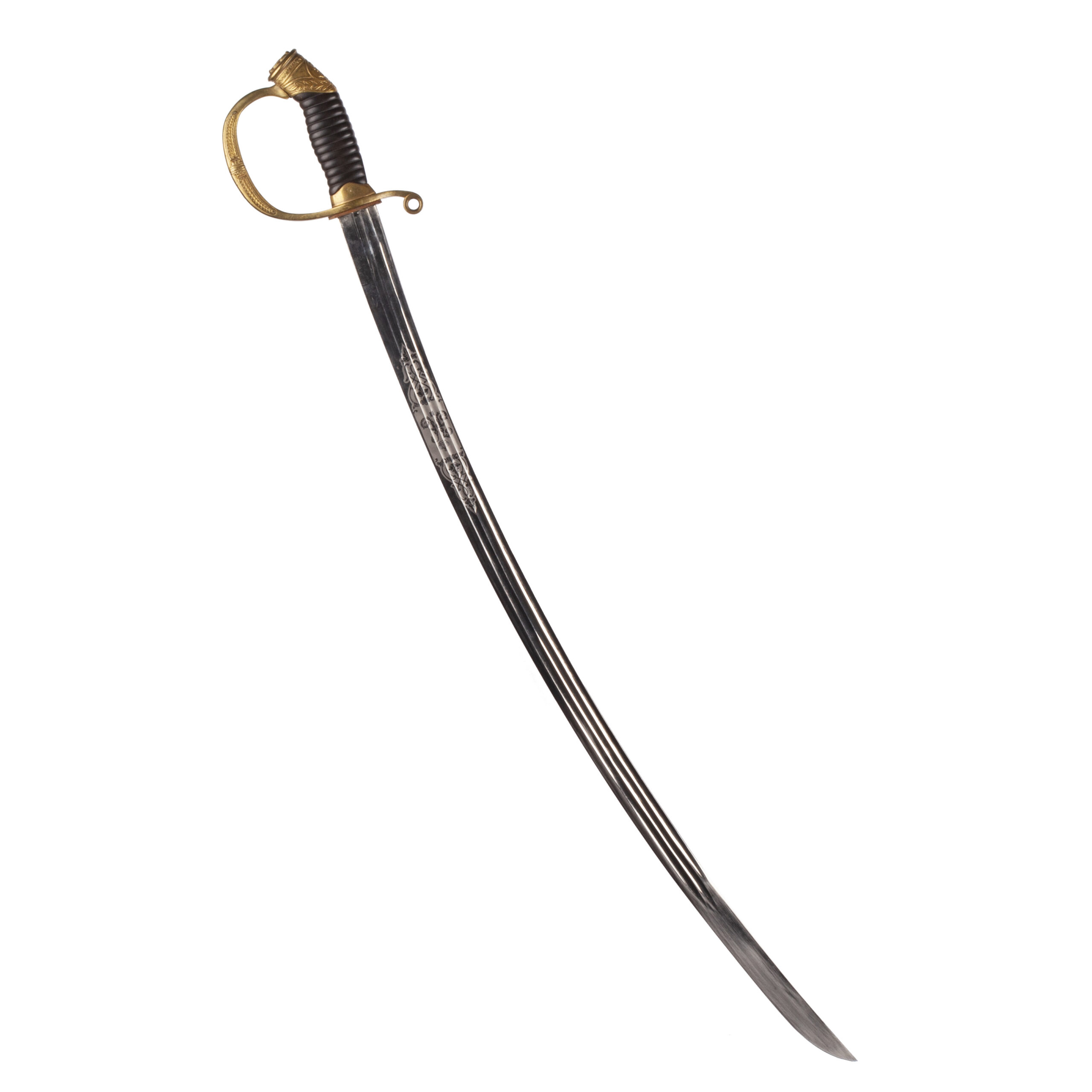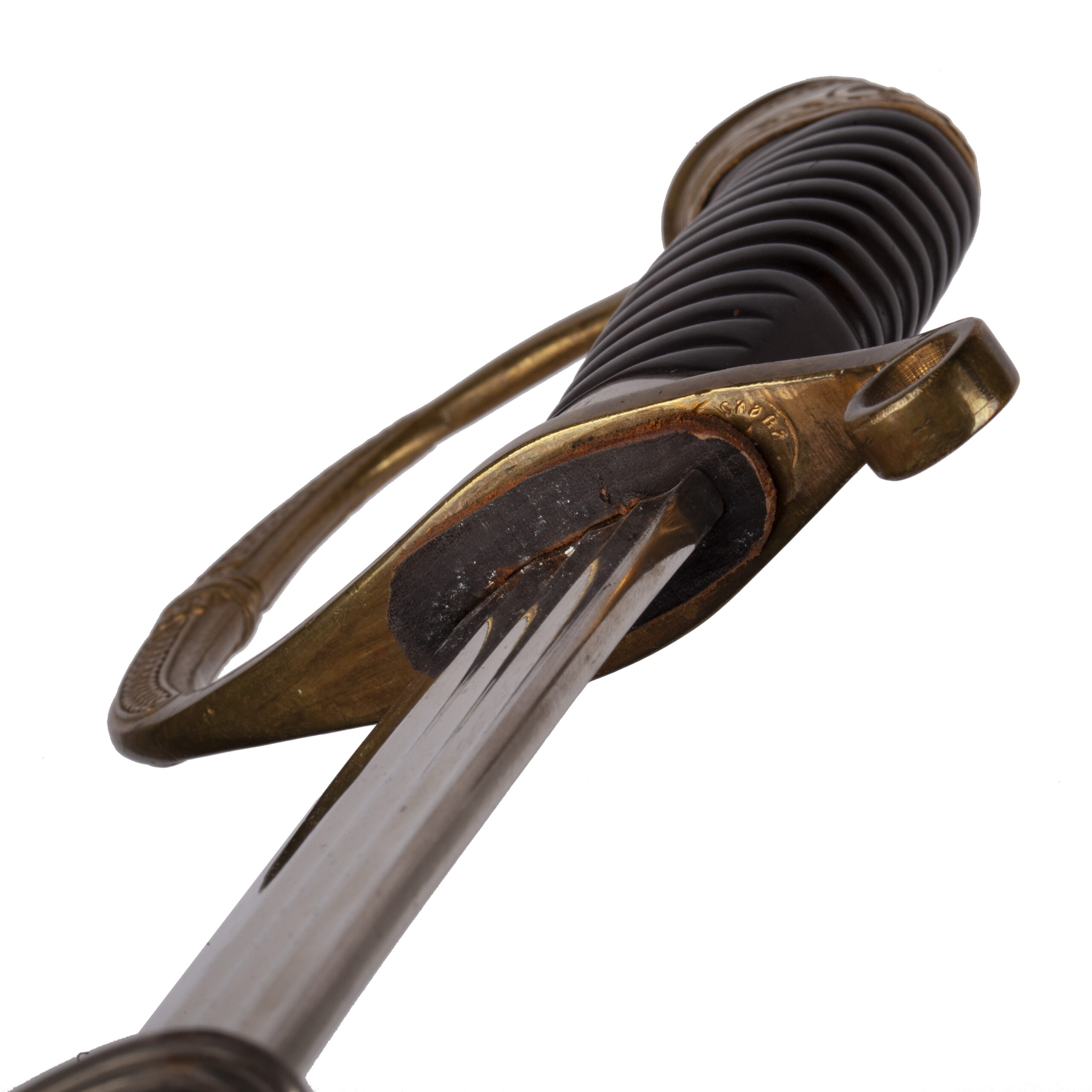 Деревянная рукоять классической формы шашки с выгнутым «клювовидным» навершием несёт отчётливый штамп «SLAVA», вероятно, обозначающий инспекцию или позднейший арсенальный знак. В комплект входят оригинальные металлические ножны с двумя кольцами подвеса, с естественными следами времени, но сохранившие первоначальную конструкцию и детали.
