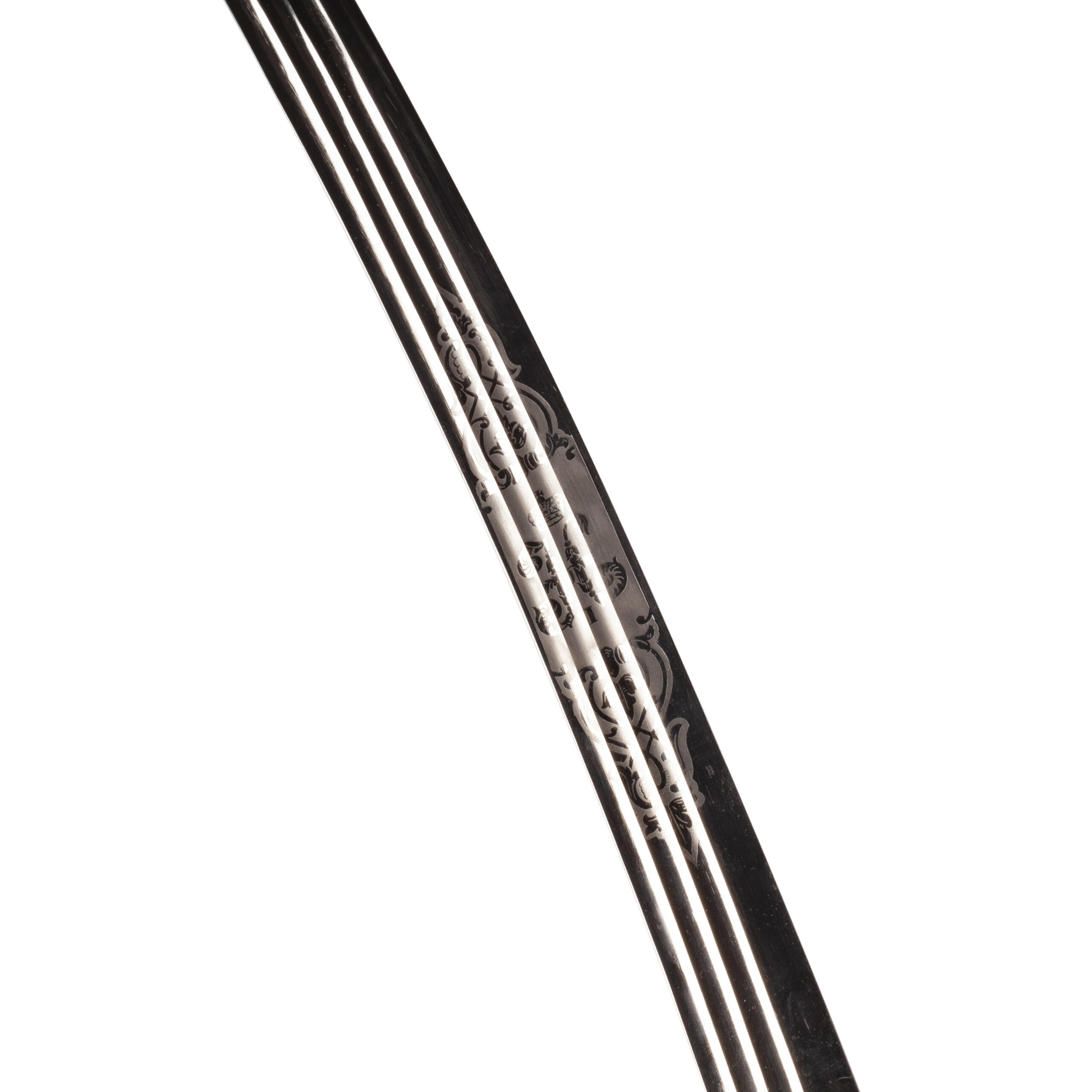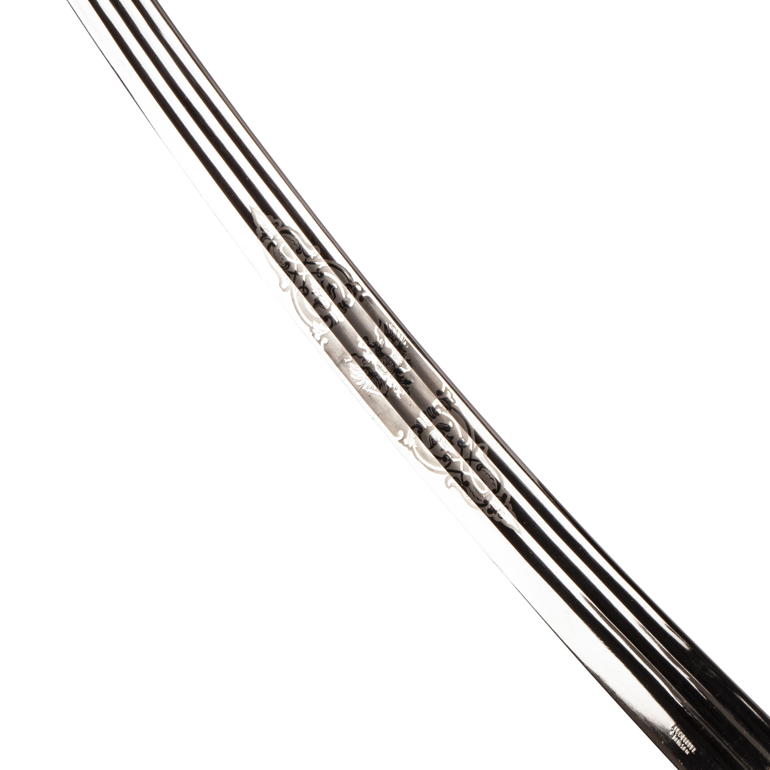 Слегка изогнутый однолезвийный клинок с тремя долами: с одной стороны травление в виде двуглавого орла, с другой — монограмма «Н II» под короной, указывающая на императора Николая II. На рикассо имеется штамп «ALEX COPPEL SOLINGEN» с фирменным символом — мечом и весами.