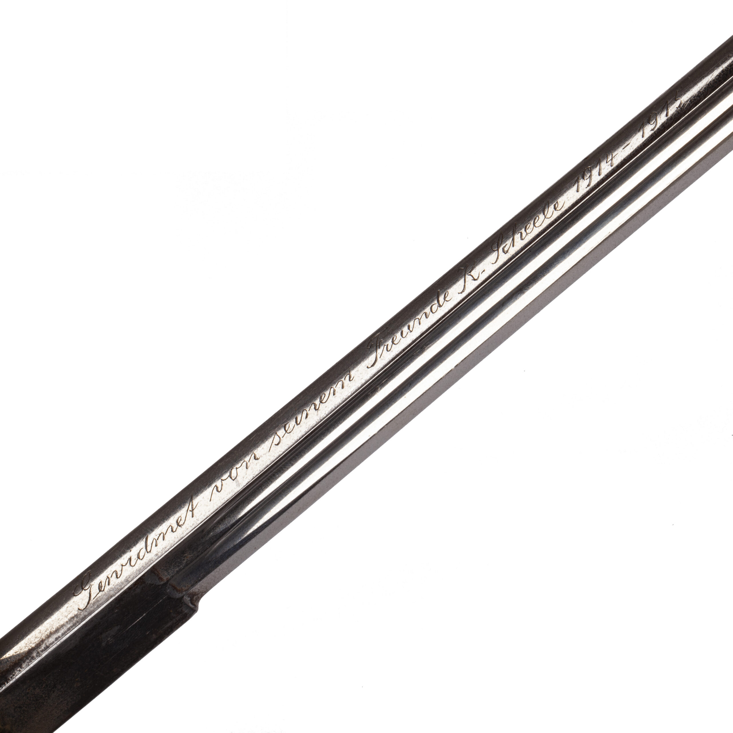 Исключительно редкий экземпляр наградного оружия. Особой деталью данного клинка является нечеткое изображение якоря под императорской короной (с лентами-пендилиями), что неоспоримо указывает на принадлежность владельца к морской пехоте.
